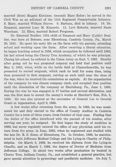 Dr. Emanuel Brallier, 10th child of Emanuel and Mary (Leidy) Brallier, was born at Belsano, near Ebensburg, Cambria County, Pa., March 20, 1841. He spent his early life on the farm with his parents, attending school and working upon the farm. After receiving a liberal education, he began teaching school in 1858, which occupation he followed until 1862, his last school being the Cherry Tree Academy, of which he was the principal. Closing his school, he enlisted in the Union Army on Sept. 7, 1862. Shortly after going out he was promoted corporal and held that position until May 2, 1863, when, while on the battle field at Chancellorsville, he was promoted to second sergeant, which rank he held for some time, being then promoted to first sergeant, serving as such until near the close of the war, when he received his commission as captain. At the organization of the company he was chosen company clerk, and occupied that position until the dissolution of the company at Harrisburg, Pa., June 1, 1865. During the war he was engaged in 17 battles and several skirmishes, and was the first man to mount the enemy's works at Hatcher's Run, Feb 5, 1865. He was also present at the surrender of General Lee to General Grant at Appomattox, April 9, 1865.
