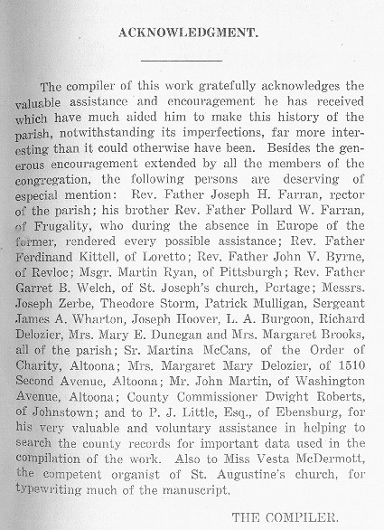 The compiler of this work gratefully acknowledges the valuable assistance and encouragement he has received which have much aided him to make this history of the parish, notwithstanding its imperfections, far more interesting than it could otherwise have been. Besides the generous encouragement extended by all the members of the congregation, the following persons are deserving of especial mention: Rev. Father Joseph H. Farran, rector of the parish; his brother Rev. Father Pollard W. Farran, of Frugality, who during the absence in Europe of the former, rendered every possible assistance; Rev. Father Ferdinand Kittell, of Loretto; Rev. Father John V. Byrne, of Revloc; Msgr. Martin Ryan, of Pittsburgh; Rev. Father Garret B. Welch, of St. Joseph's church, Portage; Messrs. Joseph Zerbe, Theodore Storm, Patrick Mulligan, Sergeant James A. Wharton, Joseph Hoover, L. A. Burgoon, Richard Delozier, Mrs. Mary E. Dunegan and Mrs. Margaret Brooks, all of the parish; Sr. Martina McCans, of the Order of Charity, Altoona; Mrs. Margaret Mary Delozier, of 1510 Second Avenue, Altoona; Mr. John Martin, of Washington Avenue, Altoona; County Commissioner Dwight Roberts, of Johnstown; and to P. J. Little, Esq., of Ebensburg, for his very valuable and voluntary assistance in helping to search the county records for important data used in the compilation of the work. Also to Miss Vesta McDermott, the competent organist of St. Augustine's church, for typewriting much of the manuscript.
