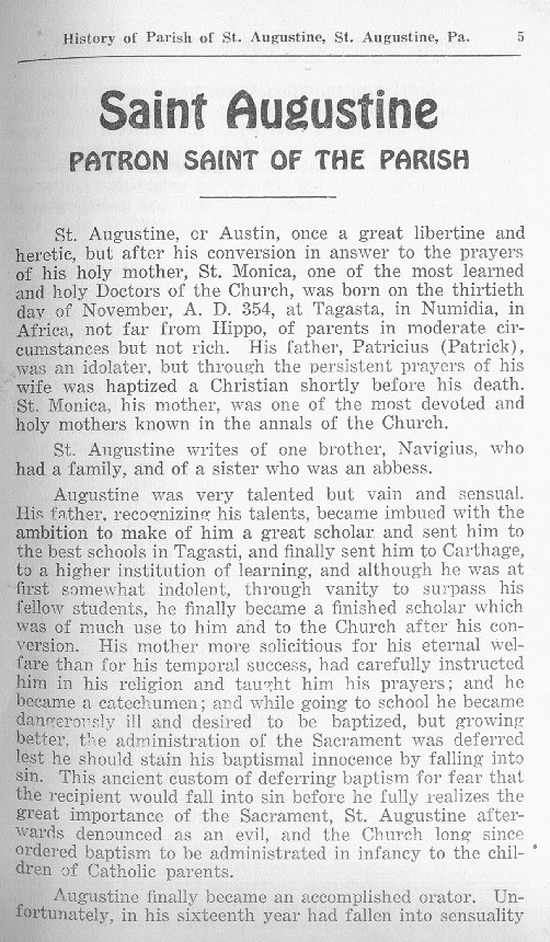 St. Augustine, or Austin, once a great libertine and heretic, but after his conversion in answer to the prayers of his holy mother, St. Monica, one of the most learned and holy Doctors of the Church, was born on the thirtieth day of November, A. D. 354, at Tagasta, in Numidia, in Africa, not far from Hippo, of parents in moderate circumstances but not rich. His father, Patricius (Patrick), was an idolater, but through the persistent prayers of his wife was baptized a Christian shortly before his death. St. Monica, his mother, was one of the most devoted and holy mothers known in the annals of the Church.