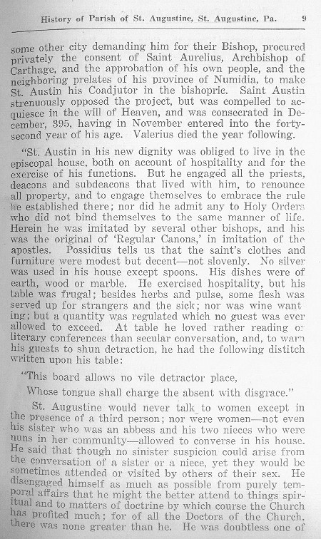 "St. Austin in his new dignity was obliged to live in the episcopal house, both on account of hospitality and for the exercise of his functions. But he engaged all the priests, deacons and subdeacons that lived with him, to renounce all property, and to engage themselves to embrace the rule he established there; nor did he admit any to Holy Orders who did not bind themselves to the same manner of life. Herein he was imitated by several other bishops, and his was the original of "Regular Canons," in imitation of the apostles. Possidius tells us that the saint's clothes and furniture were modest but decent - not slovenly. No silver was used in his house except spoons. His dishes were of earth, wood or marble. He exercised hospitality, but his table was frugal; besides herbs and pulse, some flesh was served up for strangers and the sick; nor was wine wanting; but a quantity was regulated which no guest was ever allowed to exceed. At table he loved rather reading or literary conferences than secular conversation, and, to warn his guests to shun detraction, he had the following distitch written upon his table: