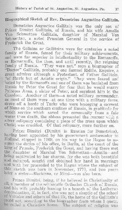 Demetrius Augustine Gallitzin was the only son of Prince Dimitri Gallitzin, of Russia, and his wife Amalia Von Schmettau Gallitzin, daughter of Marshal Von Schmettau, a noted Prussian General in the service of Frederick the Great.