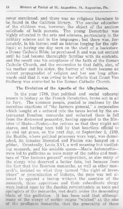 never mentioned, and there was no religious literature to be found in the Gallitzin library. The secular education of the children was, however, the object of the anxious solicitude of both parents. The young Demetrius was highly educated in the arts and sciences, particularly in the military science and in the languages; but there was, fortunately, in his inmost soul an intense longing for the spiritual; so having one day seen on the shelf of a bookstore a Douay Catholic Bible, he purchased it and was not content until he had become thoroughly familiar with its contents, and the result was his acceptance of the faith of the Roman Catholic Church, and the conversion to that faith, also, of his mother and his sister, the former of whom became an ardent propagandist of religion and her son long afterwards said that it was owing to her efforts that Count Von Stolberg was converted to the Roman Catholic Church.