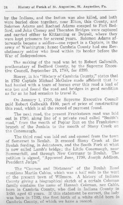 The making of the road was let to Robert Galbraith, prothonatary of Bedford County, by the Supreme Executive Council, September 25, 1788, for £393.