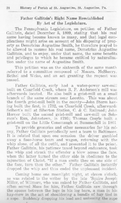 The Pennsylvania Legislature, on petition of Father Gallitzin, dated December 5, 1809, stating that his real name having become known to many, and that legal complications might arise on account of his disposing of property as Demetrius Augustine Smith, he therefore prayed to be allowed to resume his real name, Demetrius Augustine Gallitzin, and to enjoy, under that name, the same benefits and privileges to which he became entitled by naturalization under the name of Augustine Smith.