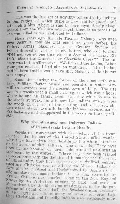 Many years ago, the late Thomas Maloney, who lived near Ashville, told me that one time, years before, his father, James Maloney, met at Cresson Springs an Indian dressed in clothes of civilization, who said to him, "Did not you at one time shoot a deer at the `Great Elk Lick,' above the Clearfields on Clearfield Creek?" The answer was in the affirmative. "Well," said the Indian, "when your gun cracked, I had aim on that deer." This Indian, had he been hostile, could have shot Maloney while his gun was empty.