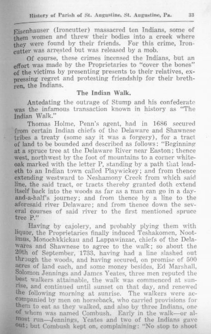 Having by cajolery, and probably plying them with liquor, the Proprietaries finally induced Teshakomen, Nootimus, Monochkkickau and Lappawinzac, chiefs of the Delawares and Shawnese to agree to the walk; so about the 20th of September, 1733, having had a line slashed out through the woods, and having secured, on promise of 500 acres of land each, and some money besides, Ed Marshall, Solomon Jennings and James Yeates, three men reputed the best walkers attainable, the walk was commenced at sunrise and continued until sunset on that day, and renewed the following morning at sunrise. The walkers were accompanied by men on horseback, who carried provisions for them to eat as they walked, and also by three Indians, one of whom was named Combush. Early in the walk - or almost run - Jennings, Yeates and two of the Indians gave out; but Combush kept on, complaining: "No stop to shoot