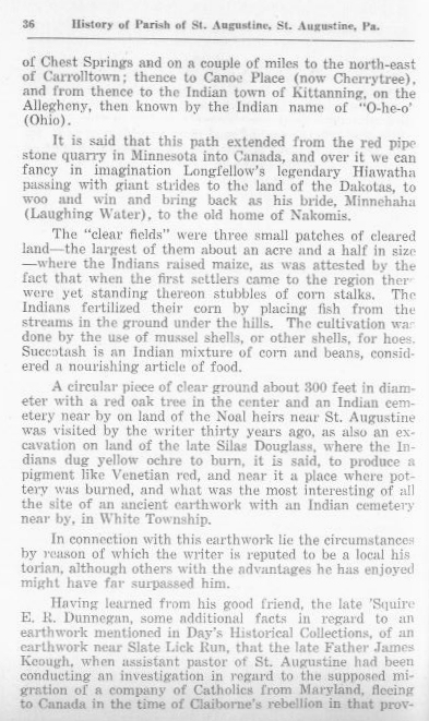 Having learned from his good friend, the late 'Squire E. R. Dunnegan, some additional facts in regard to an earthwork mentioned in Day's Historical Collections, of an earthwork near Slate Lick Run, that the late Father James Keough, when assistant pastor of St. Augustine had been conducting an investigation in regard to the supposed migration of a company of Catholics from Maryland, fleeing to Canada in the time of Claiborne's rebellion in that prov-
