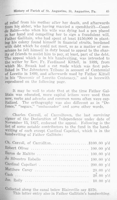 Charles Carroll, of Carrolltown, the last surviving signer of the Declaration of Independence under date of November 13, 1827, endorsed the appeal. Following is the list of some notable contributors to the fund in the handwriting of each except Cardinal Capellari, which is in the writing of Father Gallitzin: