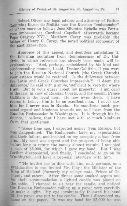 Appropos of this appeal, and doubtless antedating it, the following quotation from Reminiscences of Dr. Gallitzin to which reference has already been made, will be explanatory: "And, perhaps, emboldened by his kind and condescending manner, I said, 'Doctor Gallitzin, if you were join the Russian National Church the Greek Church)your estates would be restored. Is the difference between the Latin and Greek Churches impassable?' 'I deem the difference,' he said with a smile, 'sufficient to keep me where I am. But to your query about my property: I am dead in the law, in view of Russian Courts, and my cousin, Prince Gallitzin is the legal heir. He now owns them. I have reason to believe him to be an excellent man. I never saw him for I never was in Russia. He manifests much personal regard and kindness towards me, as I learn from the Russian Embassador in Washington. It is through his influence, I believe, that I have met with so much kindness from that gentleman.