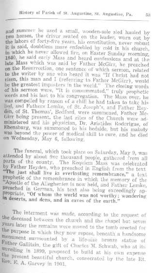 and summer he used a small, wooden-sole sled hauled by two horses, the driver seated on the leader, worn out by the labors of forty-five years, his constitution, never robust it is said, doubtless more enfeebled by cold in his church, in which he never allowed fire, on Easter Sunday morning, 1840, he said early Mass and heard confessions and at the Mass which was said by Father McGirr, he preached the Resurrection, one sentence of which sermon, related to the writer by one who heard it was "If Christ had not risen, this man and I (referring to Father McGirr), would be the greatest imposters in the world." The closing words his sermon were, "It is consummated," truly prophetic words and his last to his congregation. The Mass over, he was compelled by reason of a chill he had taken to take his bed, and Fathers Lemke, of St. Joseph's, and Father Heyden, of St. Thomas', Bedford, were summoned, Father McGirr being present, the last rites of the Church were administered and his physician, Dr. Aristides Roderigue, of Ebensburg, was summoned to his bedside, but his malady was beyond the power of medical skill to cure, and he died Wednesday, May 6, following.