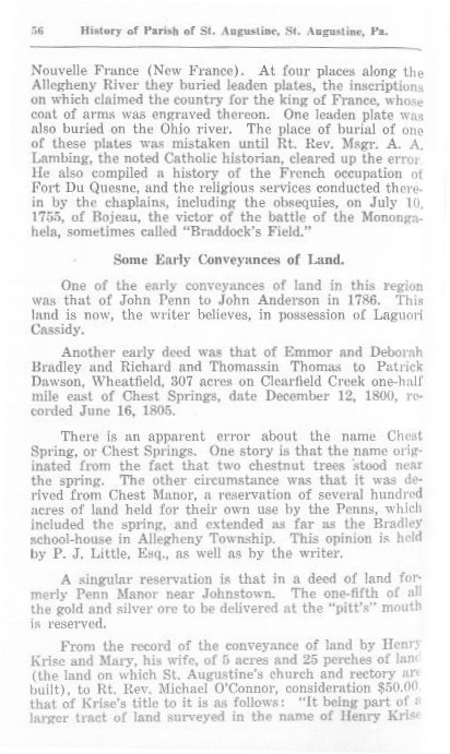 From the record of the conveyance of land by Henry Krise and Mary, his wife, of 5 acres and 25 perches of land (the land on which St. Augustine's church and rectory are built), to Rt. Rev. Michael O'Connor, consideration $50.00, that of Krise's title to it is as follows: "It being part of a larger tract of land surveyed in the name of Henry Krise