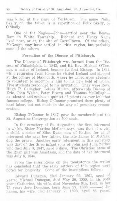 The Diocese of Pittsburgh was formed from the Diocese of Philadelphia, in 1843, and Rt. Rev. Michael 0'Connor, a native of Ireland, became its first Bishop. In 1844, while returning from Rome, he visited Ireland and stopped at the college of Maynouth, where he called upon students to volunteer to accompany him to his new field of labors. Five students responded to his invitation. They were Revs. Hugh P. Gallagher, Tobias Mullen, afterwards Bishop of Erie, John Walsh, Peter Brown and Thomas McCullagh - as talented and zealous a quintet of priests as ever left that famous college. Bishop O'Connor promised them plenty of hard labor, but not much in the way of pecuniary remuneration.