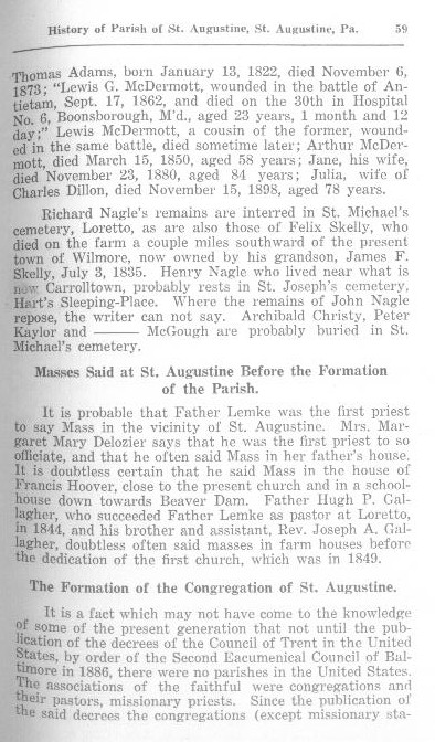 Richard Nagle's remains are interred in St. Michael's cemetery, Loretto, as are also those of Felix Skelly, who died on the farm a couple miles southward of the present town of Wilmore, now owned by his grandson, James F. Skelly, July 3, 1835. Henry Nagle who lived near what is now Carrolltown, probably rests in St. Joseph's cemetery, Hart's Sleeping-Place. Where the remains of John Nagle repose, the writer can not say. Archibald Christy, Peter Kaylor, and --- McGough are probably buried in St. Michael's cemetery.