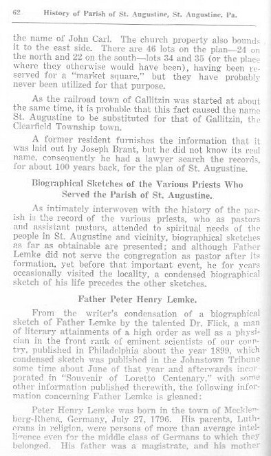 From the writer's condensation of a biographical sketch of Father Lemke by the talented Dr. Flick, a man of literary attainments of a high order as well as a physician in the front rank of eminent scientists of our country, published in Philadelphia about the year 1899, which condensed sketch was published in the Johnstown Tribune some time about June of that year and afterwards incorporated in "Souvenir of Loretto Centenary," with some other information published therewith, the following information concerning Father Lemke is gleaned: