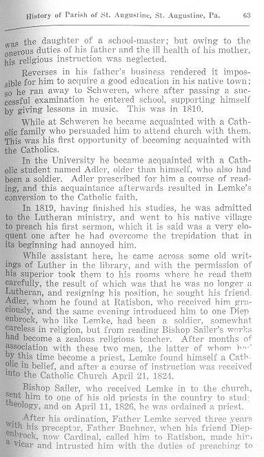 Bishop Sailer, who received Lemke in to the church, sent him to one of his old priests in the country to study theology, and on April 11, 1826, he was ordained a priest.