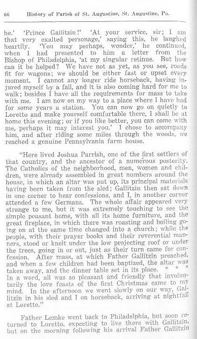 "Here lived Joshua Parrish, one of the first settlers of that country, and the ancestor of a numerous posterity. The Catholics of the neighborhood, men, women and children, were already assembled in great numbers around the house, in which an altar was put up, its principal materials having been taken from the sled; Gallitzin then sat down in one corner to hear confessions, and I, in another corner attended a few Germans. The whole affair appeared very strange to me, but it was extremely touching to see the simple peasant home, with all its home furniture, and the great fireplace, in which there was roasting and boiling going on at the same time changed into a church; while the people, with their prayer books and their reverential manners, stood or knelt under the low projecting roof or under the trees, going in or out, just as their turn came for confession. After mass, at which Father Gallitzin preached, and when a few children had been baptized, the altar was taken away, and the dinner table set in its place. * * *