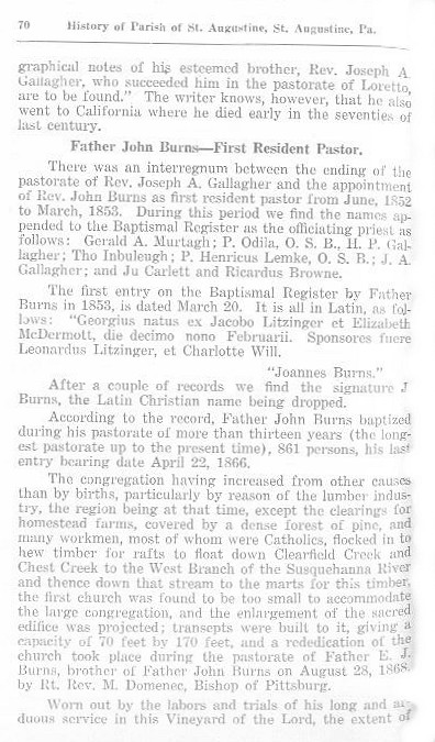 There was an interregnum between the ending of the pastorate of Rev. Joseph A. Gallagher and the appointment of Rev. John Burns as first resident pastor from June, 1852 to March, 1853. During this period we find the names appended to the Baptismal Register as the officiating priest as follows: Gerald A. Murtagh; P. Odila, 0. S. B., H. P. Gallagher; Tho Inbuleugh; P. Henricus Lemke, 0. S. B.; J. A. Gallagher; and Ju Carlett and Ricardus Browne.