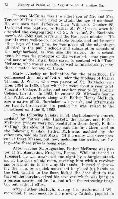 After leaving St. Augustine, Father McEnrue was pastor of St. Augustine, Freeport, Penna. While stationed at Freeport, he was awakened one night by a burglar standing at the door of his room, covering him with a revolver and ordering him to throw up his hands. Instead of throwing them up, by a quick movement he placed his hands on the bed, vaulted to the floor, kicked the door shut in the face of the burglar, seized his revolver, which was lying on a bureau nearby and fired a shot after the retreating burglar, but without effect.
