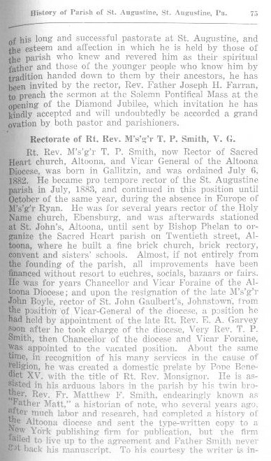 Rt. Rev. M's'g'r T. P. Smith, now Rector of Sacred Heart church, Altoona, and Vicar General of the Altoona Diocese, was born in Gallitzin, and was ordained July 6, 1882. He became pro tempore rector of the St. Augustine parish in July, 1883, and continued in this position until October of the same year, during the absence in Europe of M's'g'r Ryan. He was for several years rector of the Holy Name church, Ebensburg, and was afterwards stationed at St. John's, Altoona, until sent by Bishop Phelan to organize the Sacred Heart parish on Twentieth street, Altoona, where he built a fine brick church, brick rectory, convent and sisters' schools. Almost, if not entirely from the founding of the parish, all improvements have been financed without resort to euchres, socials, bazaars or fairs. He was for years Chancellor and Vicar Foraine of the Altoona Diocese; and upon the resignation of the late M's'g'r John Boyle, rector of St. John Gaulbert's, Johnstown, from the position of Vicar-General of the diocese, a position he had held by appointment of the late Rt. Rev. E. A. Garvey soon after he took charge of the diocese, Very Rev. T. P. Smith, then Chancellor of the diocese and Vicar Foraine, was appointed to the vacated position. About the same time, in recognition of his many services in the cause of religion, he was created a domestic prelate by Pope Benedict XV. with the title of Rt. Rev. Monsignor. He is assisted in his arduous labors in the parish by his twin brother, Rev. Fr. Matthew F. Smith, endearingly known as "Father Matt," a historian of note, who several years ago, after much labor and research, had completed a history of the Altoona diocese and sent the type-written copy, to a New York publishing firm for publication, but the firm failed to live up to the agreement and Father Smith never got back his manuscript. To his courtesy the writer is in-