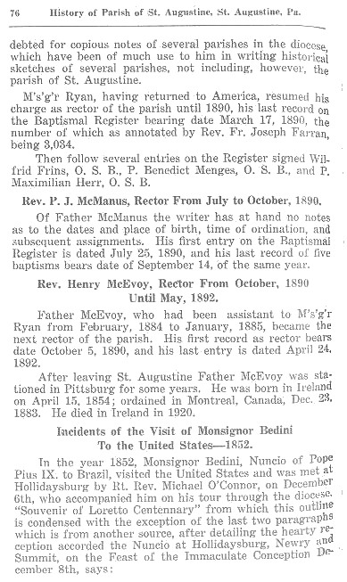 After leaving St. Augustine Father McEvoy was stationed in Pittsburg for some years. He was born in Ireland on April 15, 1854; ordained in Montreal, Canada, Dec. 23, 1883. He died in Ireland in 1920.