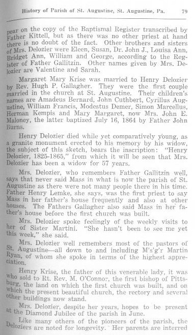 Margaret Mary Krise was married to Henry Delozier by Rev. Hugh P. Gallagher. They were the first couple married in the church at St. Augustine. Their children's names are Amadeus Bernard, John Cuthbert, Cyrillus Augustine, William Francis, Modestus Demer, Simon Marcellus, Herman Kempis and Mary Margaret, now Mrs. John E Maloney, the latter baptized July 16, 1864 by Father John Burns.