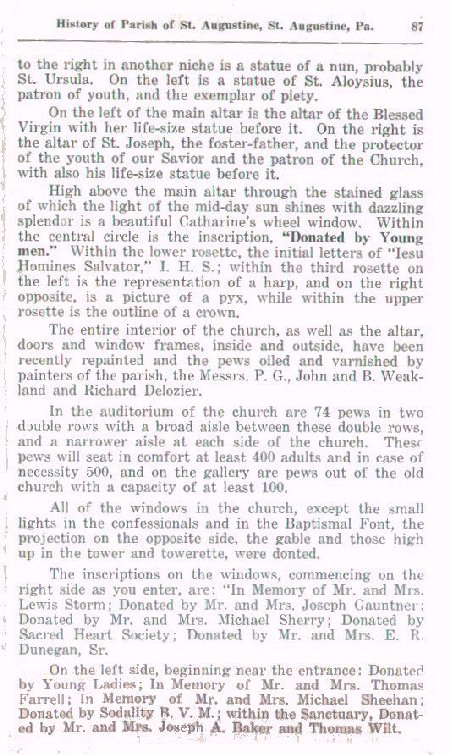 The inscriptions on the windows, commencing on the right side as you enter, are: "In Memory of Mr. and Mrs. Lewis Storm; Donated by Mr. and Mrs. Joseph Gauntner; Donated by Mr. and Mrs. Michael Sherry; Donated by Sacred Heart Society; Donated by Mr. and Mrs. E. R. Dunegan, Sr.