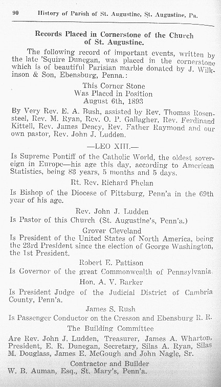 The following record of important events, written by the late 'Squire Dunegan, was placed in the cornerstone which is of beautiful Parisian marble donated by J. Wilkinson & Son, Ebensburg, Penna.: