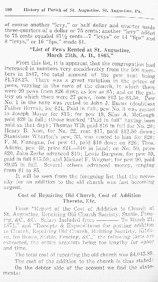 From this list, it is apparent that the congregation had increased in numbers very considerably from the 500 members in 1847, the total amount of the pew rent being $1,728.25. There was a great variation in the prices of pews, varying in the nave of the church, in which there were 99 pews from $26 down as low as $5; and on the gallery on which there were 27 pews, from $13 to $3.50. Pew No. 1 in the nave was rented to John J. Burns (doubtless Father Burns), for $21, Paid in full; pew No. 3 was rented to Joseph Moyer for $13; for pew 18, Silas A. McGough paid $20 in full; (those marked "Paid in full" having been paid on that day); Thomas Wilt paid $16 in full for No. 20; Henry B. Noel, for No. 22, rent $17, paid $12.50 down; Stanislaus Wharton's pew, 33, was rented to him for $20; F. M. Flanagan, for pew 41, paid $10 down on $26; Thos. Adams, pew 49, price $21 - $10 in hand; on No. 50, price $20, John Zerbe advanced $10; Lewis Burgoon, for pew 59, paid in full $15.50; and Michael F. Wagner, for pew 90, paid $9.25 in full. Several others advanced money, ranging from $1 to $5.