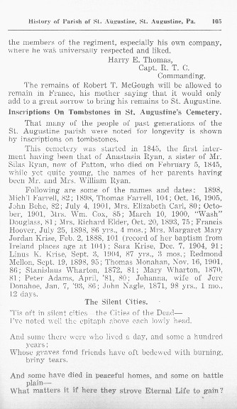 This cemetery was started in 1845, the first interment having been that of Anastasia Ryan, a sister of Mr. Silas Ryan, now of Patton, who died on February 5, 1845, while yet quite young, the names of her parents having been Mr. and Mrs. William Ryan.