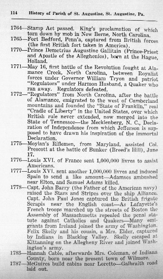 Capt. John Barry (the Father of the American navy) raised the Stars and Stripes over the ship Alliance. Capt. John Paul Jones captured the British frigate Serapis near the English coast - As Lafayette's French troops marched up the streets of Boston the Assembly of Massachusetts repealed the penal statute against Catholics and Quakers - Many emigrants from Ireland joined the army of Washington. Felix Skelly and his cousin, a Mrs. Elder, captured by Indians in Blacklog Valley. Skelly escaped at Kittanning on the Allegheny River and joined Washington's army. |