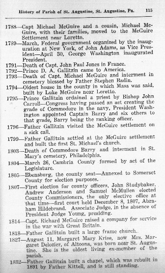 Father Gallitzin settled at the McGuire settlement and built the first St. Michael's church. |