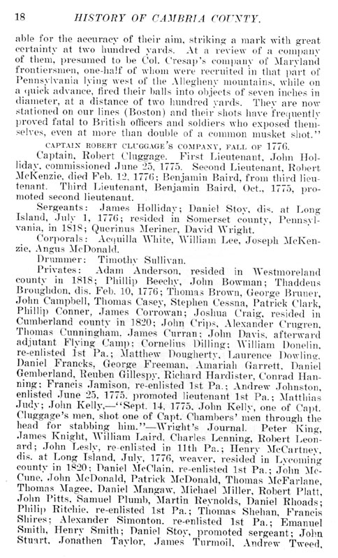 able for the accuracy of their aim, striking a mark with great certainty at two hundred yards. At a review of a company of them, presumed to be Col. Cresap's company of Maryland frontiersmen, one-half of whom were recruited in that part of Pennsylvania lying west of the Allegheny mountains, while on a quick advance, fired their halls into objects of seven inches in diameter, at a distance of two hundred yards. They are now stationed on our lines (Boston) and their shots have frequently proved fatal to British officers and soldiers who exposed themselves, even at more than double of a common musket shot." CAPTAIN ROBERT CLUGGAGE'S COMPANY, FALL OF 1776.