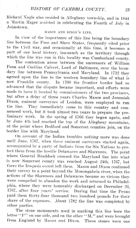 Richard Nagle also resided in Allegheny township, and in 1844 a Martin Eager assisted in celebrating the Fourth of July in Johnstown. MASON AND DIXON'S LINE.