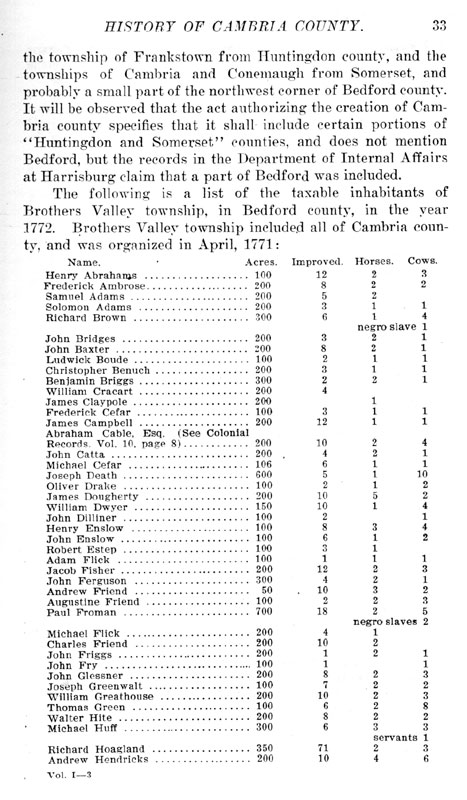The following is a list of the taxable inhabitants of Brothers Valley township, in Bedford county, in the year 1772. Brothers Valley township included all of Cambria county, and was organized in April, 1771: