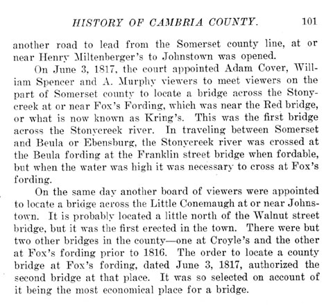 another road to lead from the Somerset county line, at or near Henry Miltenberger's to Johnstown was opened. On June 3, 1817, the court appointed Adam Cover, William Spencer and A. Murphy viewers to meet viewers on the part of Somerset county to locate a bridge across the Stonycreek at or near Fox's Fording, which was near the Red bridge, or what is now known as Kring's. This was the first bridge across the Stonycreek river. In traveling between Somerset and Beula or Ebensburg, the Stony creek river was crossed at the Beula fording at the Franklin street bridge when fordable, but when the water was high it was necessary to cross at Fox's fording. On the same day another board of viewers were appointed to locate a bridge across the Little Conemaugh at or near Johnstown. It is probably located a little north of the Walnut street bridge, but it was the first erected in the town. There were but two other bridges in the county--one at Croyle's and the other at Fox's fording prior to 1816. The order to locate a county bridge at Fox's fording, dated June 3, 1817, authorized the second bridge at that place. It was so selected on account of it being the most economical place for a bridge. |