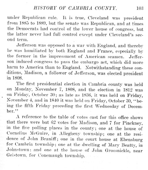 under Republican rule. It is true, Cleveland was president from 1885 to 1889, but the senate was Republican, and at times the Democrats had control of the lower house of congress, but the latter never had full control except under Cleveland's second term. Jefferson was opposed to a war with England, and thereby he was humiliated by both England and France, especially by the former in the impressment of American seamen. Jefferson induced congress to pass the embargo act, which did more harm to America than to England. Notwithstanding these conditions, Madison, a follower of Jefferson, was elected president in 1808. The first presidential election in Cambria county was held on Monday, November 7, 1808, and the election in 1812 was on Friday, October 30; as late as 1836, it was held on Friday, November 4, and in 1810 it was held on Friday, October 30, "being the fifth Friday preceding the first Wednesday of December." A reference to the table of votes cast for this office shows that there were but 62 votes for Madison, and 7 for Pinckney, in the five polling places in the county; one at the house of Cornelius McGuire, in Allegheny township; one at the residence of John Braniff; one in the court house at Ebensburg for Cambria township; one at the dwelling of Mary Beatty, in Johnstown; and one at the house of John Grossnickle, near Geistown, for Conemaugh township. |