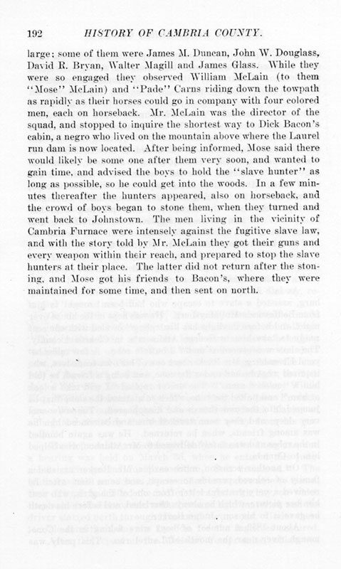 large; some of them were James M. Duncan, John W. Douglass, David R. Bryan, Walter Magill and James Glass. While they were so engaged they observed William McLain (to them "Mose" McLain) and "Pade" Carns riding down the towpath as rapidly as their horses could go in company with four colored men, each on horseback. Mr. McLain was the director of the squad, and stopped to inquire the shortest way to Dick Bacon's cabin, a negro who lived on the mountain above where the Laurel run dam is now located. After being informed, Mose said there would likely be some one after them very soon, and wanted to gain time, and advised the boys to hold the "slave hunter" as long as possible, so he could get into the woods. In a few minutes thereafter the hunters appeared, also on horseback, and the crowd of boys began to stone them, when they turned and went back to Johnstown. The men living in the vicinity of Cambria Furnace were intensely against the fugitive slave law, and with the story told by Mr. McLain they got their guns and every weapon within their reach, and prepared to stop the slave hunters at their place. The latter did not return after the stoning, and Mose got his friends to Bacon's, where they were maintained for some time, and then sent on north.