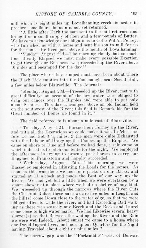 mill which is eight miles up Loyalhanning creek, in order to procure some flour; the man is not yet returned. "A little after Dark the man sent to the mill returned and brought us a small supply of flour and a few pounds of Butter. We have to acknowledge our obligations to Col'o Will'm Perrey, who furnished us with a horse and sent his son to mill for us for the flour. He lived just above the mouth of Loyalhanning. "Sunday. August 22d.--The morning cloudy but so much time already Elapsed we must make every possable Exertion to get through our Bussness; we proceeded up the River above 10 miles and encamped for the day." The place where they camped must have been about where the Black Lick empties into the Conemaugh, near Social Hall, a few miles below Blairsville. The Journal: "Monday, August 23d.--Proceeded up the River; met with great difficulty; on account of the low water were obliged to drag our canoes over the Ripples and were able to get only about 8 miles. This day Encamped above an old Indian field on the southwest of the River; this field is Remarkable for the Great number of Bones we found in it." The field referred to is about a mile east of Blairsville. “Tuesday, August 24. Pursued our Jorney up the River, and with all the Exerscions we could make it was 1 o'clock before we had Got 3 1/2 miles, & the men were quite Exhausted with the Labour of Dragging the Canoes up the Ripples. We came on shore to Dine and before we had done, a rain came on which induced us to pitch our tents for the night. We employed the afternoon in trying to procure pack horses to carry our Baggage to Frankstown and happily succeeded. "Wednesday, August 25th.--This morning we were Busseyley employed in adjusting the Loads for the horses. As soon as this was done we took our packs on our Backs, and started at 11 o'clock and made the Best of our way up the River. We had got but a little when we were overtaken by a smart shower at a place where we had no shelter of any kind. We proceeded up through the narrows where the River Cuts the Chestnut Ridge; these narrows are five miles in Length and the hill(s) come Down close to the water edge, so that we were obliged often to wade the river, and had Exceeding Bad walking as there was scarcely any Beech and the Rocks and Laurel come close to high water mark. We had Likewise several heavy shower(s) so that Between the wading the River and the Rain we were wet Indeed. About sunset we came to a house where one David Ingard lives, and took up our Quarters for the Night having Traveled about eight or nine miles." The narrow gap was the "Packsaddle" west of Bolivar. |