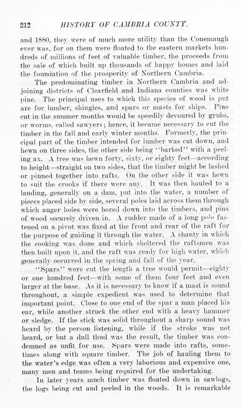 and 1880, they were of much more utility than the Conemaugh ever was, for on them were floated to the eastern markets hundreds of millions of feet of valuable timber, the proceeds from the sale of which built up thousands of happy homes and laid the foundation of the prosperity of Northern Cambria. The predominating timber prosperity Northern Cambria and adjoining districts of Clearfield and Indiana counties was white pine. The principal uses to which this species of wood is put are for lumber, shingles, and spars or masts for ships. Pine cut in the summer months would be speedily devoured by grubs, or worms, called sawyers; hence, it became necessary to cut the timber in the fall and early winter months. Formerly, the principal part of the timber intended for lumber was cut down, and hewn on three sides, the other side being "barked" with a peeling ax. A tree was hewn forty, sixty, or eighty feet-according to height--straight on two sides, that the timber might be lashed or pinned together into rafts. On the other side it was hewn to suit the crooks if there were any. It was then hauled to a landing, generally on a dam, put into the water, a number of pieces placed side by side, several poles laid across them through which auger holes were bored down into the timbers, and pins of wood securely driven in. A rudder made of a long pole fastened on a pivot was fisted at the front and rear of the raft for the purpose of guiding it through the water. A shanty in which the cooking was done and which sheltered the raftsmen was then built upon it, and the raft was ready for high water, which generally occurred in the spring and fall of the year. “Spars" were cut the length a tree would permit--eighty or one hundred feet--with some of them four feet and even larger at the base. As it is necessary to know if a mast is sound throughout, a simple expedient was used to determine that important point. Close to one end of the spar a man placed his ear, while another struck the other end with a heavy hammer or sledge. If the stick was solid throughout a sharp sound was heard by the person listening, while if the stroke was not heard, or but a dull thud was the result, the timber was condemned as unfit for use. Spars were made into rafts, sometimes along with square timber. The job of hauling them to the water's edge was often a very laborious and expensive one, many men and teams being required for the undertaking. In later years much timber was floated down in sawlogs, the logs being cut and peeled in the woods. It is remarkable |
