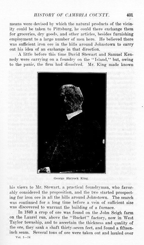 means were devised by which the natural products of the vicinity could be taken to Pittsburg, he could there exchange them for groceries, dry goods, and other articles, besides furnishing employment to a large number of men here. He believed there was sufficient iron ore in the hills around Johnstown to carry out his idea of an exchange in that direction. A little before this time David Stewart and Samuel Kennedy were carrying on a foundry on the "Island," but, owing to the panic, the firm had dissolved. Mr. King made known ![]() George Shryock King.