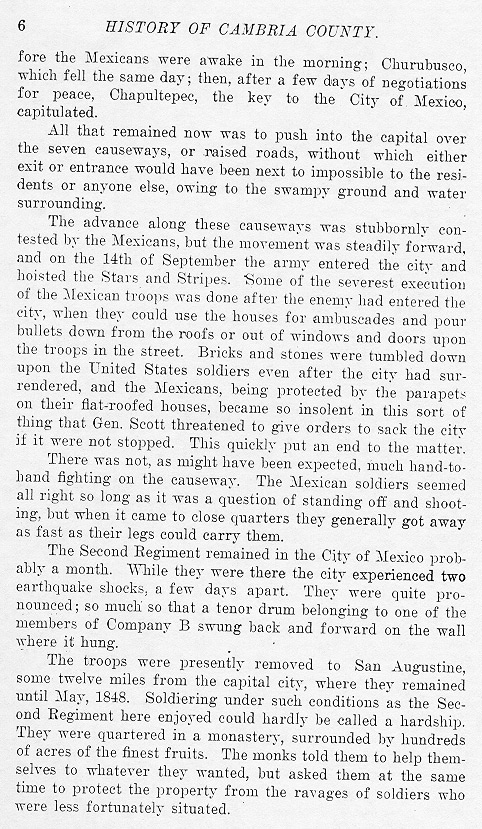 fore the Mexicans were awake in the morning; Churubusco, which fell the same day; then, after a few days of negotiations for peace, Chapultepec, the key to the City of Mexico, capitulated. All that remained now was to push into the capital over the seven causeways or raised roads, without which either exit or entrance would have been next to impossible to the residents or anyone else, owing to the swampy ground and water surrounding. The advance along these causeways was stubbornly contested by the Mexicans, but the movement was steadily forward, and on the 14th of September the army entered the city and hoisted the Stars and Stripes. Some of the severest execution of the Mexican troops was done after the enemy had entered the city, when they could use the houses for ambuscades and pour bullets down from the roofs or out of windows and doors upon the troops in the street. Bricks and stones were tumbled down upon the United States soldiers even after the city had surrendered, and the Mexicans, being protected by the parapets on their flat-roofed houses, became so insolent in this sort of thing that Gen. Scott threatened to give orders to sack the city if it were not stopped. This quickly put an end to the matter. There was not, as might have been expected, much hand-to-hand fighting on the causeway. The Mexican soldiers seemed all right so long as it was a question of standing off and shooting, but when it came to close quarters they generally got away as fast as their legs could carry them. The Second Regiment remained in the City of Mexico probably a month. While they were there the city experienced two earthquake shocks, a few days apart. They were quite pronounced; so much so that a tenor drum belonging to one of the members of company B swung back and forward on the wall where it hung. The troops were presently removed to San Augustine, some twelve miles from the capital city, where they remained until May, 1948. Soldiering under such conditions as the Second Regiment here enjoyed could hardly be called a hardship. They were quartered in a monastery, surrounded by hundreds of acres of the finest fruits. The monks told them to help themselves to whatever they wanted, but asked them at the same time to protect the property from the ravages of soldiers who were less fortunately situated. |