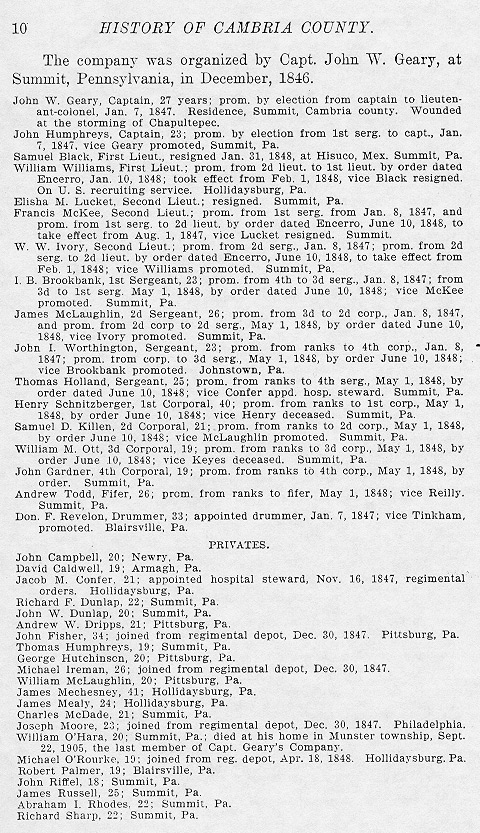 - John W. Geary, Captain, 27 years; prom. by election from captain to lieutenant-colonel, Jan. 7, 1847. Residence, Summit, Cambria county. Wounded at the storming of Chapultepec.