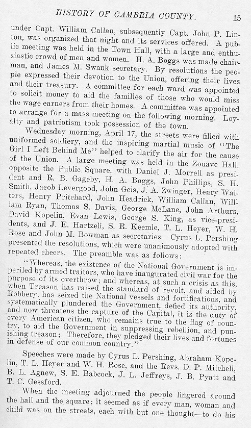 under Capt. William Callan, subsequently Capt. John P. Linton, was organized that night and its services offered. A public meeting was held in the Town Hall, with a large and enthusiastic crowd of men and women. H.A. Boggs was made chairman, and James M. Swank secretary. By resolutions the people expressed their devotion to the Union, offering their lives and their treasury. A committee for each ward was appointed to solicit money to aid the families of those who would miss the wage earners from their homes. A committee was appointed to arrange for a mass meeting on the following morning. Loyalty and patriotism took possession of the town. Wednesday morning, April 17, the streets were filled with uniformed soldiery, and the inspiring martial music of “The Girl I Left Behind Me” helped to clarify the air for the cause of the Union. A large meeting was held in the Zouave Hall, opposite the Public Square, with Daniel J. Morrell as president and R. B. Gageby, H. A. Boggs, John Phillips, S. H. Smith, Jacob Levergood, John Geis, J. A. Zwinger, Henry Walters, Henry Pritchard, John Headrick, William Callan, William Ryan, Thomas S. Davis, George McLane, John Arthurs, David Kopelin, Evan Lewis, George S. King, as vice presidents, and J. E. Hartzell, S. R. Keemle, T. L. Heyer, W. H. Rose and John M. Bowman as secretaries. Cyrus L. Pershing presented the resolutions, which were unanimously adopted with repeated cheers. The preamble was as follows: “Whereas, the existence of the National Government is imperiled by armed traitors, who have inaugurated civil war for the purpose of its overthrow; and whereas, at such a crisis as this, when Treason has raised the standard of revolt, and aided by Robbery, has seized the National vessels and fortifications, and systematically plundered the Government, defied its authority and now threatens the capture of the Capital, it is the duty of every American citizen, who remains true to the flag of country, to aid the Government in suppressing rebellion, and punishing treason; Therefore, they pleged their lives and fortunes in defense of our common country.” Speeches were made by Cyrus L. Pershing, Abraham Kopelin, T. L. Heyer, and W. H. Rose, and the Revs. D. P. Mitchell, B. L. Agnew, S. E. Babcock, J. L. Jeffreys, J. B. Pyatt and T. C. Gessford. When the meeting adjourned the people lingered around the hall and square; it seemed as if every man, woman and child was on the streets, each with but one thought – to do his |