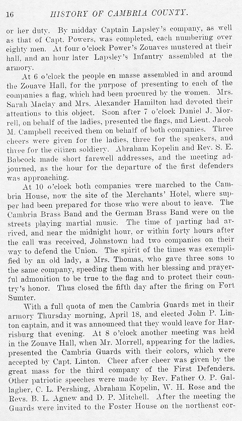or her duty. By midday Captain Lapsley's company, as well as that of Capt. Powers, was completed, each numbering over eighty men. At Four o'clock Power's Zouaves mustered at their hall, and an hour later Lapsley's Infantry assembled at the armory. At 6 o'clock the people en masse assembled in and around the Zouave Hall, for the purpose of presenting to each of the companies a flag, which had been procured by the women. Mrs. Sarah Maclay and Mrs. Alexander Hamilton had devoted their attentions to this object. Soon after 7 o'clock Daniel J. Morrell, on behalf of the ladies, presented the flags, and Lieut. Jacob M. Campbell received them on behalf of both companies. Three cheers were given for the ladies, three for the speakers, and three for the citizens soldiery. Abraham Kopelin and Rev. S. E. Babcock made short farewell addresses, and the meeting adjourned, as the hour for the departure of the first defenders was approaching. At 10 o'clock both companies were marched to the Cambria House, now the site of the Merchants' Hotel, where supper had been prepared for those who were about to leave. The Cambria Brass Band and the German Brass Band were on the streets playing martial music. The time of parting had arrived, and near the midnight hour, or within forty hours after the call was received, Johnstown had two companies on their way to defend the Union. The spirit of the times was exemplified by an old lady, a Mrs. Thomas, who gave three sons to the same company, speeding them with her blessing and prayerful admonition to be true to the flag and to protect their country's honor. Thus closed the fifth day after the firing on Fort Sumter. With a full quota of men the Cambria Guards met in their armory Thursday morning, April 18, and elected John P. Linton captain, and it was announced that they would leave for Harrisburg that evening. At 8 o'clock another meeting was held in the Zouave Hall, when Mr. Morrell, appearing for the ladies, presented the Cambria Guards with their colors, which were accepted by Capt. Linton Cheer after cheer was given by the great mass for the third company of the First Defenders. Other patriotic speeches were made by Rev. Father O. P. Gallagher, C. L. Pershing, Abraham Kopelin, W. H. Rose and the Revs. B. L Agnew and D. P. Mitchell. After the meeting the Guards were invited to the Foster House on the northeast cor- |