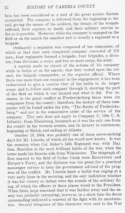 bria has been considered as a unit of the great armies therein assembled. The company is followed from the beginning to the end, giving the names of the soldiers, the details of the wounds inflicted, their capture or death, and their military service so far as is possible. However, while the company is engaged on the field or on the march the smallest unit is usually a regiment or a brigade. Ordinarily a regiment was composed of ten companies, of which at that time each completed company consisted of 105 men; four regiments formed a brigade; four brigades, a division; four divisions, a corps. And two or more corps, the army. A captain made no report of the actions of his company while in battle or on the march; that duty rested upon the colonel, the brigade commander, or the superior official. Where there was more than one company in the engagement, it has been endeavored to give a concise view of the battle in its larger scope, and to follow each company through it, showing the part of the field on which it was located and what it did. For instance, in the great conflict at Fredericksburg there were six companies from the county; therefore, the history of these companies will be found under the title, “The Battle of Fredericksburg,” and not in the consecutive order of the service of the company. This rule does not apply to Company C, 19th U.S. Infantry, from Ebensburg, inasmuch as it was the only one from the county in the western armies, and its history is continuous, beginning at Shiloh and ending at Atlanta. October 19, 1864, was probably one of these nerve-racking days for Mr. Lincoln, of which all the world now knows. It was the occasion when Col. Stuter's 54th Regiment was with Maj. Gen. Sheridan in the most brilliant battle of the war, when the latter made his famous ride from Winchester. The telegraph offices nearest to the field of Cedar Creek were Rectortown and Harper's Ferry, and the distance was too great for a practical messenger service to keep the government advised of the progress of the conflict. Mr. Lincoln knew a battle was raging at a very early hour in the morning, and the only indication whether it was for victory or defeat were the sounds of the artillery firing, of which the officers at these places wired to the President. When faint, hope reasoned that it was farther away and the enemy was probably retreating; however, in a short time the fierce cannonading indicated a renewal of the fight with its uncertainties. Several telegrams of this character were sent to the War |