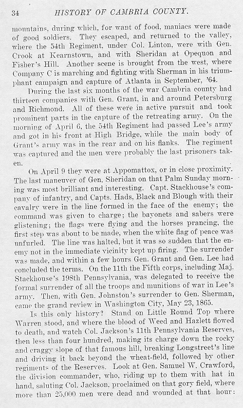 mountains, during which, for want of food, maniacs were made of good soldiers. They escaped, and returned to the valley, where the 54th Regiment, under Col. Linton, were with Gen. Crook at Kearnstown, and with Sheridan at Opequon and Fisher's Hill. Another scene is brought from the west, where Company C is marching and fighting with Sherman in his triumphant campaign and capture of Atlanta in September, '64. During the last six months of the war Cambria county had thirteen companies with Gen. Grant, in and around Petersburg and Richmond. All of these were in active pursuit and took prominent parts in the capture of the retreating army. On the morning of April 6, the 54th Regiment had passed Lee's army and got in his front at High Bridge, while the main body of Grant's army was in the rear and on his flanks. The regiment was captured and the men were probably the last prisoners taken. On April 9 they were at Appomattox, or in close proximity. The last maneuver of Gen. Sheridan on that Palm Sunday morning was most brilliant and interesting. Capt. Stackhouse's company of infantry, and Capt. Hads, Black and Blough with their cavalry were in the line formed in the face of the enemy; the command was given to charge; the bayonets and sabers were glistening; the flags were flying and the horses prancing, the first step was about to be made, when the white flag of peace was unfurled. The line was halted, but it was so sudden that the enemy not in the immediate vicinity kept up firing. The surrender was made, and within a few hours Gen. Grant and Gen. Lee had concluded the terms. On the 11th the Fifth corps, including Maj. Stackhouse's 198th Pennsylvania, was delegated to received the formal surrender of all the troops and munitions of war in Lee's army. Then, with Gen. Johnston's surrender to Gen. Sherman, came the grand review in Washington City, May 23, 1865. Is this only history? Stand on Little Round Top where Warren stood, and where the blood of Weed and Hazlett flowed to death, and watch Col. Jackson's 11th Pennsylvania Reserves, then less than four hundred, making its charge down the rocky and craggy slope of that famous hill, breaking Longstreet's line and driving it back beyond thewheat-field, followed by other regiments of the Reserves. Look at Gen. Samuel W. Crawford, the division commander, who, riding up to them with hat in hand, saluting Col. Jackson, proclaimed on that gory field, where more than 25,000 men were dead and wounded at that hour: |