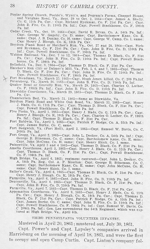 - Appomattox Courthouse, Va., April 9, 1865—Capt. Henry J. Hads, Co. G, 11th Pa. Cav.; Capt. Henry J. Blough, Co. K, 18th Pa. Cav.; Capt. Thomas D. Black, Co. F, 21st Pa. Cav.; Capt. Patrick F. Hodge, Co. A, 55th Pa. Inf,; Capt. James Burke, Co. C, same; Capt. John B. Fite, Co. D, 110th Pa. Inf.; Capt. Powell Stackhouse, Co. F, 198th Pa. Inf.: Capt. Samuel W. Davis, Co. C. 209th Pa. Inf.: Gen. Lee surrendered the 54th Regiment, which was captured at High Bridge, Va., April 6th.