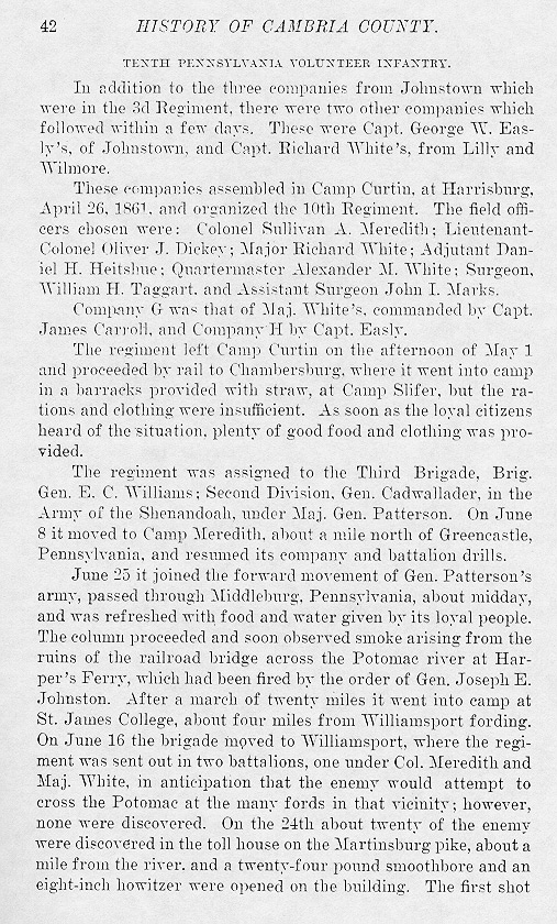 In addition to the three companies from Johnstown which were in the 3d Regiment, there were two other companies which followed within a few days. These were Capt. George W. Easly's of Johnstown, and Capt. Richard White's from Lilly and Wilmore. These companies assembled in Camp Curtin, at Harrisburg, April 2, 1861, and organized the 10th Regiment. The field officers chosen were: Colonel Sullivan A. Meredith; Lieutenant-Colonel Oliver J. Dickey; Major Richard White; Adjutant Daniel H. Heitshue; Quartermaster Alexander M. White; Surgeon, William H. Taggart, and Assistant Surgeon John I. Marks. Company G was that of Maj. White's commanded by Capt. James Carroll, and Company H by Capt. Easly. The regiment left Camp Curtin on the afternoon of May 1 and proceeded by rail to Chambersburg, where it went into camp in a barracks provided with straw, at Camp Slifer, but the rations and clothing were insufficient. As soon as the loyal citizens heard of the situation, plenty of good food and clothing was provided. The regiment was assigned to the Third Brigade, Brig. Gen. E. C. Williams; Second Division, Gen Cadwallader, in the Army of the Shenandoah, under Maj. Gen. Patterson. On June 8 it moved to Camp Meredith, about a mile north of Greencastle, Pennsylvania, and resumed its company and batalion drills. June 25 it joined the forward movement of Gen. Patterson's army, passed through Middleburg, Pennsylvania, about midday, and was refreshed with food and water given by its loyal people. The column proceeded and soon observed smoke arising from the ruins of the railroad bridge across the Potomac river at Harper's Ferry, which had been fired by the order of Gen. Joseph E. Johnston. After a march of twenty miles it went into camp at St. James College, about four miles from Williamsport fording. On June 16 the brigade moved to Williamsport, where the regiment was sent out in two battalions, one under Co. Meredith and Maj. White, in anticipation that the eneny would attempt to cross the Potomac at the many fords in that vicinity; however, none were discovered. On the 24th about twenty of the enemy were discovered in the toll house on the Martinsburg pike, about a mile from the river. And a twenty-four pound smoothbore and an eight-inch howitzer were opened on the building. The first shot |