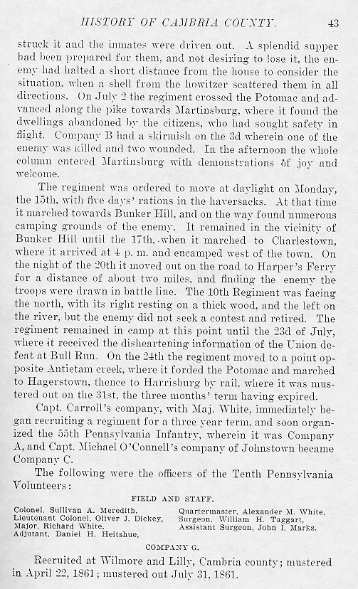 struck it and the inmates were driven out. A splendid supper had been prepared for them, and not desiring to lose it, the enemy had halted a short distance from the house to consider the situation, when a shell from the howitzer scattered them in all directions. On July 2 the regiment crossed the Potomac and advanced along the pike towards Martinsburg, where it found the dwellings abandoned by the citizens, who had sought safety in flight. Company B had a skirmish on the 3d wherein one of the enemy was killed and tow wounded. In the afternoon the whole column entered Martinsburg with demonstrations of joy and welcome. The regiment was ordered to move at daylight on Monday, the 15th, with five days' rations in the haversacks. At that time it marched towards Bunker Hill, and on the way found numerous camping grounds of the enemy. It remained in the vicinity of Bunker Hill until the 17th, when it marched to Charlestown, where it arrived at 4 p.m. and encamped west of the town. On the night of the 20th it moved out on the road to Harper's Ferry for a distance of about two miles, and finding the enemy the troops were drawn in battle line. The 10th Regiment was facing the north, with its right resting on a thick wood, and the left on the river, but the enemy did not seek a contest and retired. The regiment remained in camp at this point until the 23d of July, where it received the disheartening information of the Union defeat at Bull Run. On the 24th the regiment moved to a point opposite Antietam creek, where it forded the Potomac and marched to Hagerstown, thence to Harrisburg by rail, where it was mustered out on the 31st, the three months' term having expired. Capt. Carroll's company, with Maj. White, immediately began recruiting a regiment for a three year term, and soon organized the 55th Pennsylvania Infantry, wherein it was Company A, and Capt. Michael O'Connell's company of Johnstown became Company C. The following were officers of the Tenth Pennsylvania Volunteers: FIELD AND STAFF