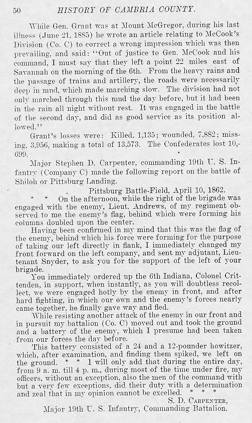 While Gen. Grant was at Mount McGregor, during his last illness (June 21, 1885) he wrote an article relating to McCook's Division (Co. C) to correct a wrong impression which was then prevailing and said: "Out of justice to Gen. McCook and his command, I must say that they left a point 22 miles east of Savannah on the morning of the 6th. From the heavy rains and the passage of trains and artillery, the roads were necessarily deep in mud, which made marching slow. The division had not only marched through this mud the day before, but it had been in the rain all night without rest. It was engaged in the battle of the second day, and did as good service as its position allowed." Grant's losses were: Killed, 1,135; wounded, 7,882, missing, 3,956, making a total of 13,573. The Confederates lost 10,699. Major Stephen D. Carpenter, commanding 19th U.S. Infantry (Company C) made the following report on the battle of Shiloh or Pittsburg Landing. Pittsburg Battle-Field, April 10,1862.